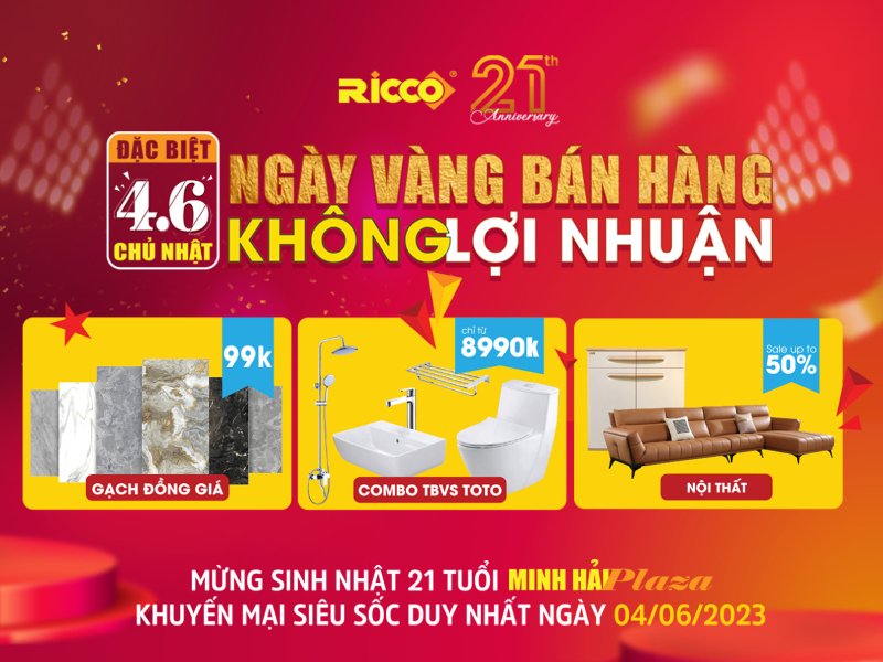 Nhân dịp sinh nhật 21 tuổi, Ricco Minh Hải tổ chức chương trình khuyến mại NỘI THẤT RICCO tri ân khách hàng với hàng ngàn ưu đãi cực hấp dẫn chỉ có tại showroom Minh Hải Plaza ngày 04/06/2023:
